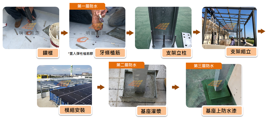 依據設計圖上的標示位置,進行植筋放樣,使用植筋膠將牙條固定,接著組裝支撐結構鋼構,利用支架或鋼構材料搭建支撐架,為太陽能系統提供依托。